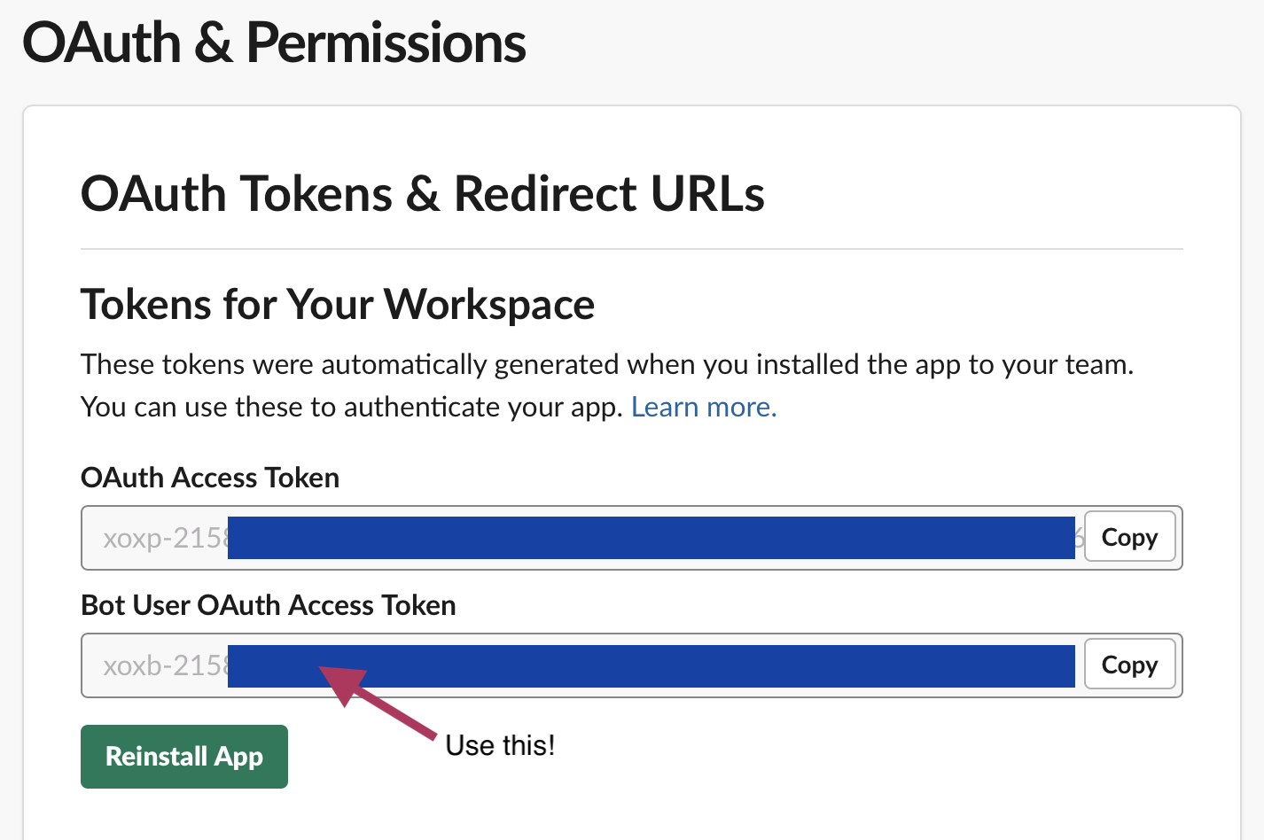 If you are using new Slack Bot Token Scopes, make sure that you are also using the Bot User OAuth Access Token and not the legacy user-based OAuth Access Token. The OAuth Access Token will not fail immediately, but will always be restricted by the rights of the user who requested the app installation.
