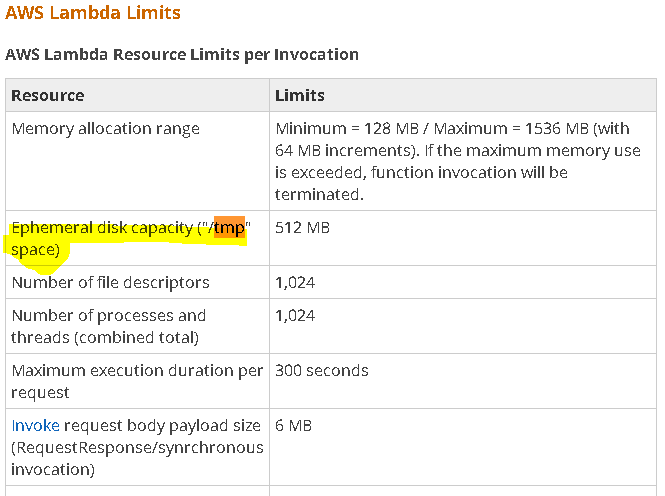 Thus, we have 512 MB for create files. Here is my code for me in lambda aws, for me works like charm.