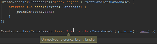 Events.handler(Handshake::class, object : EventHandler<Handshake> { override fun handle(event: Handshake) { println(event.sent) } })